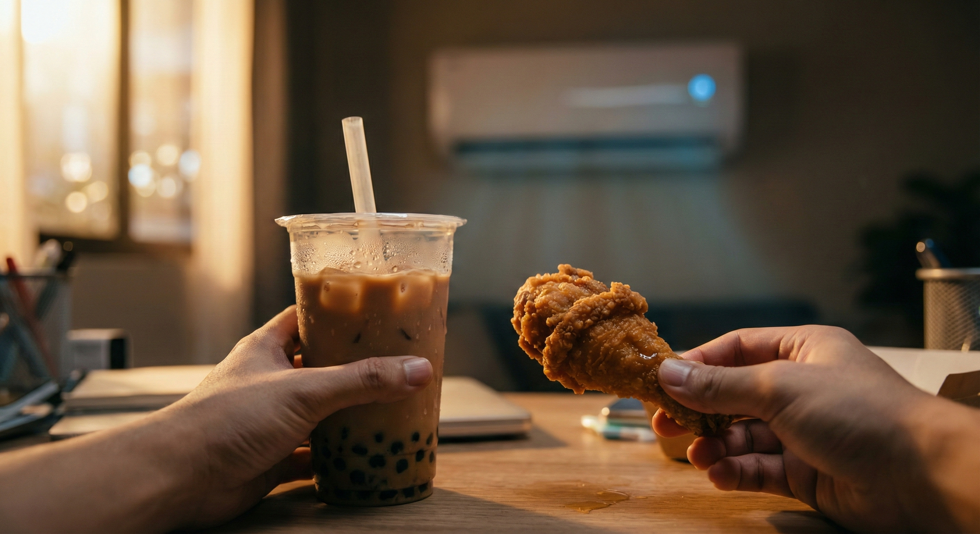 最典型组合:夏天在空调房里,左手奶茶(甜腻+冰冷),右手炸鸡(油腻)。这简直是给脾胃的「组合暴击」。