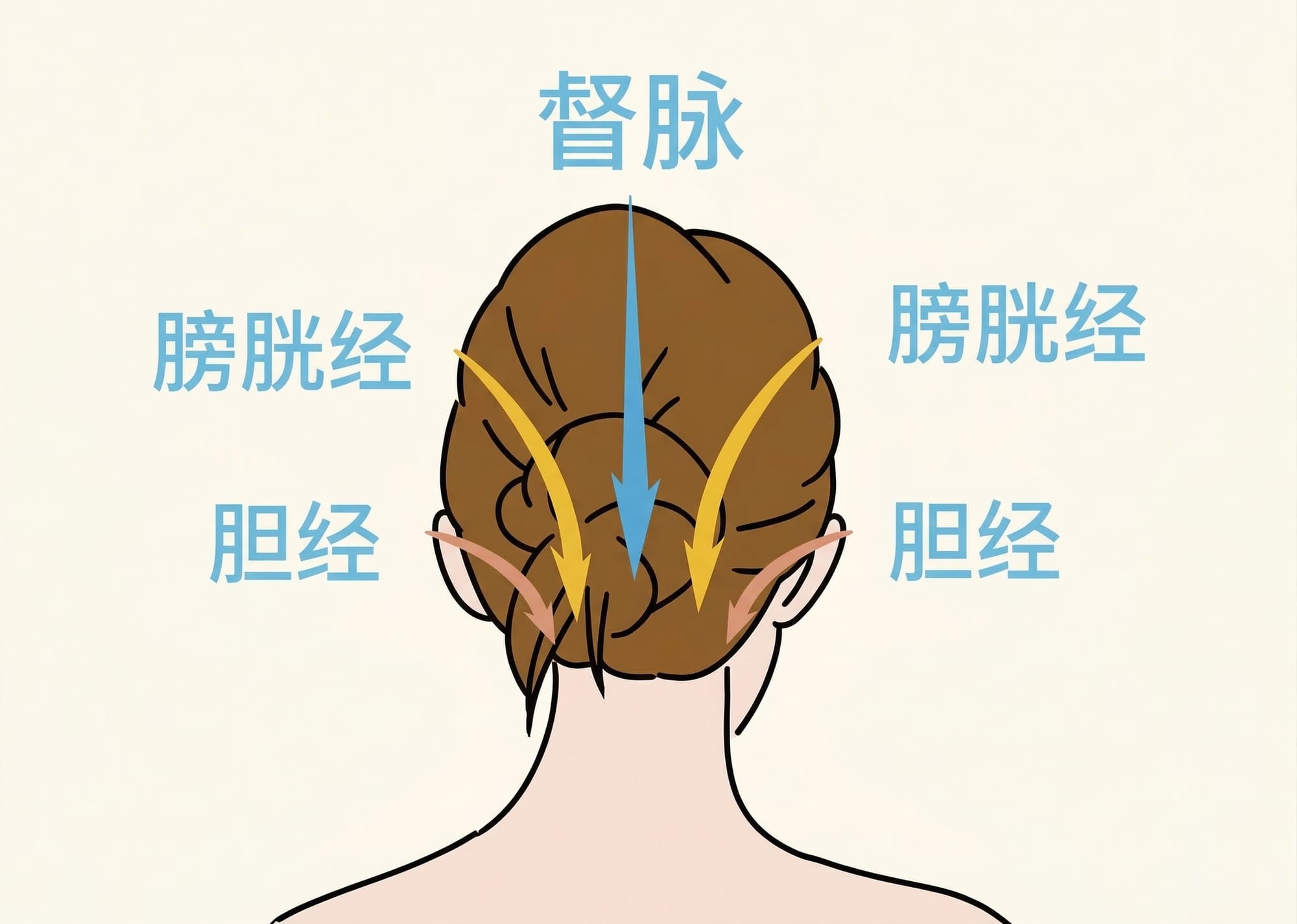 - 从眼珠上方发际线梳到后脑勺发际线 - 梳两侧胆经